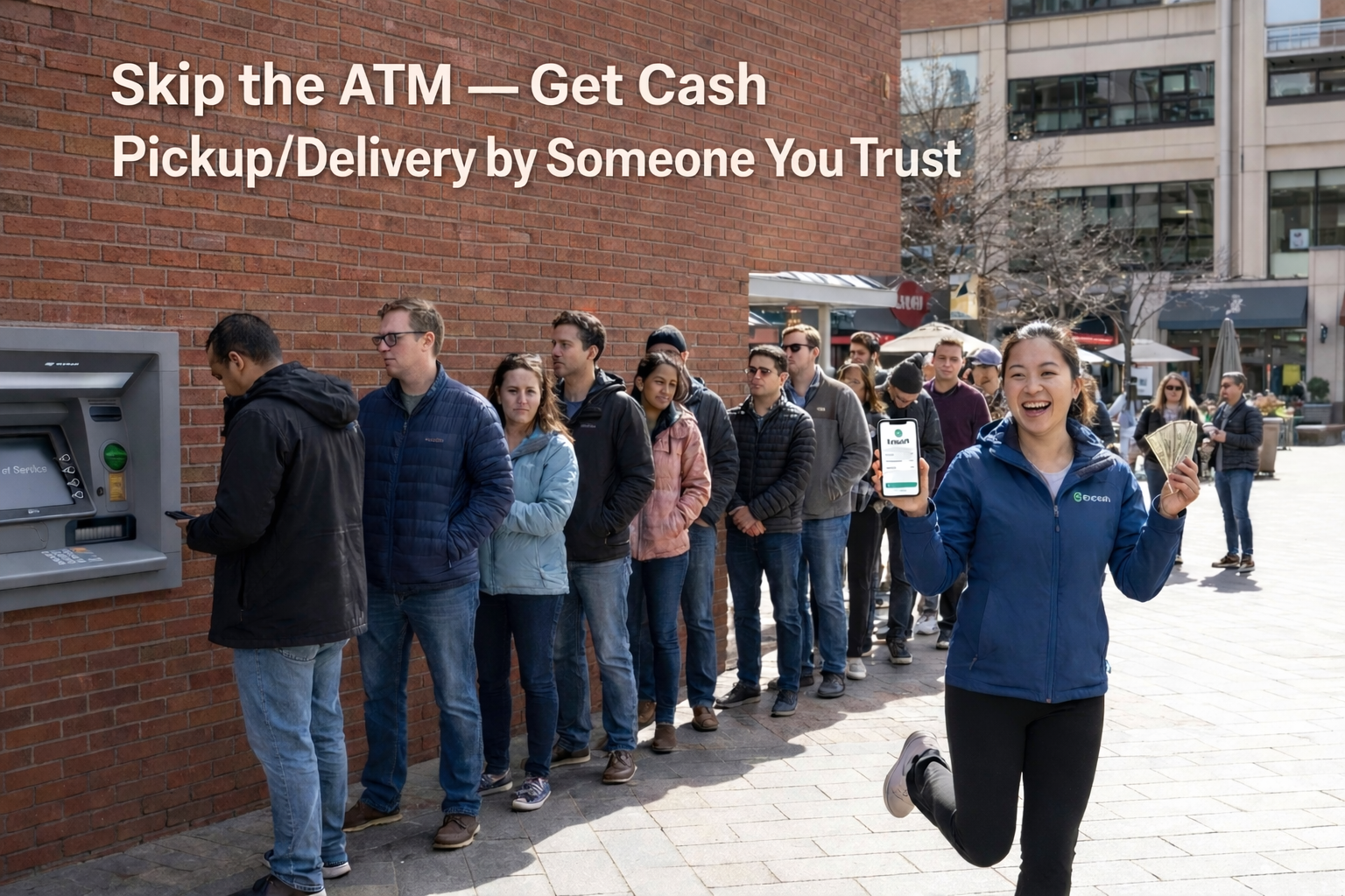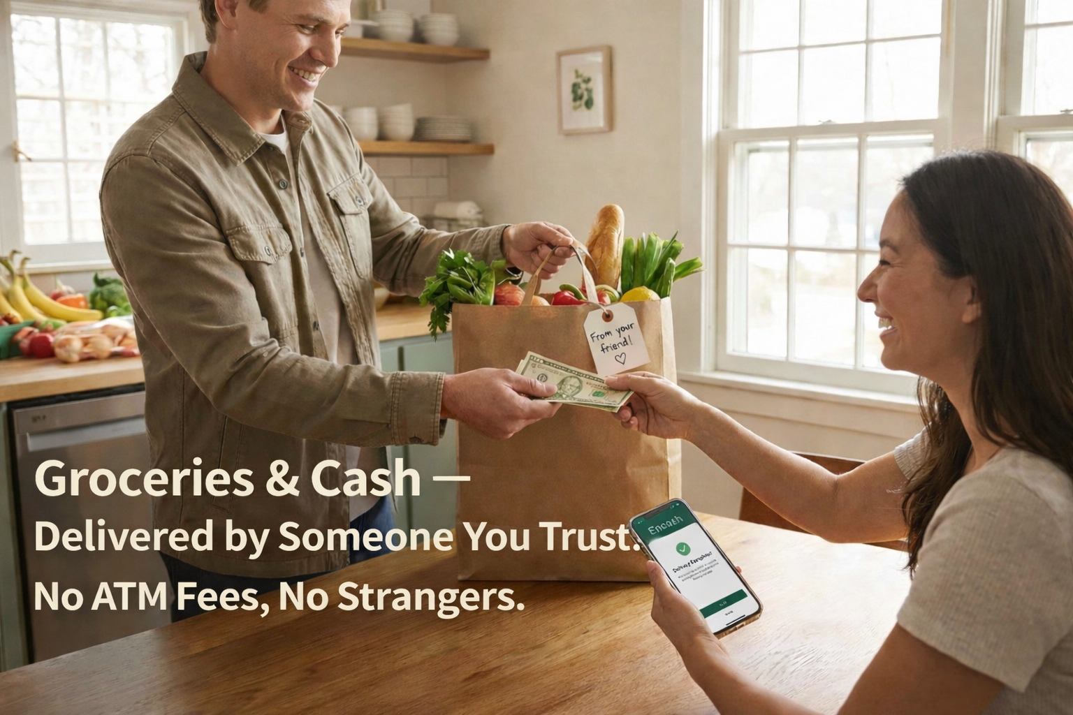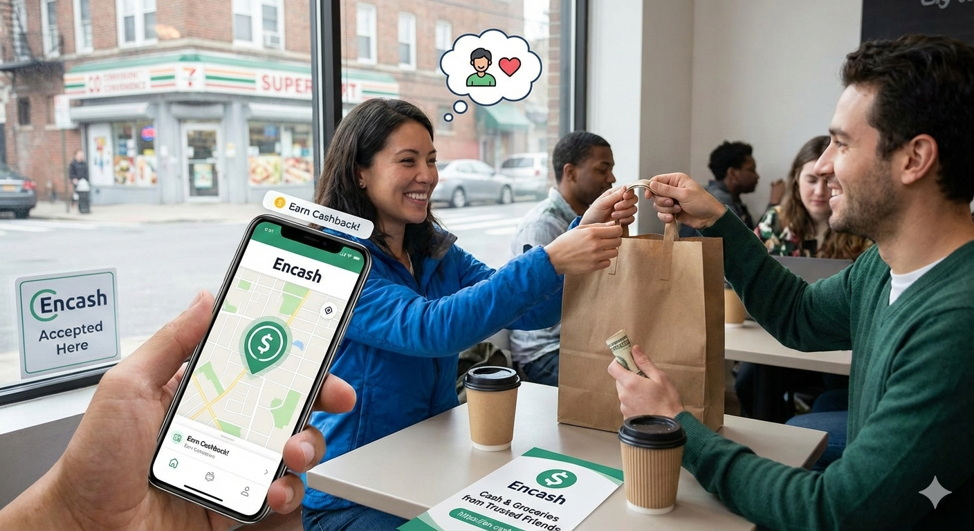 Encash lets you order groceries and get cash back from nearby stores, delivered by someone you choose — no ATM fees, no strangers.